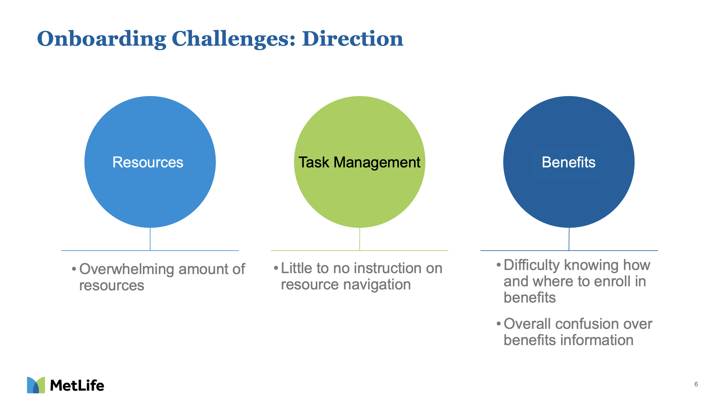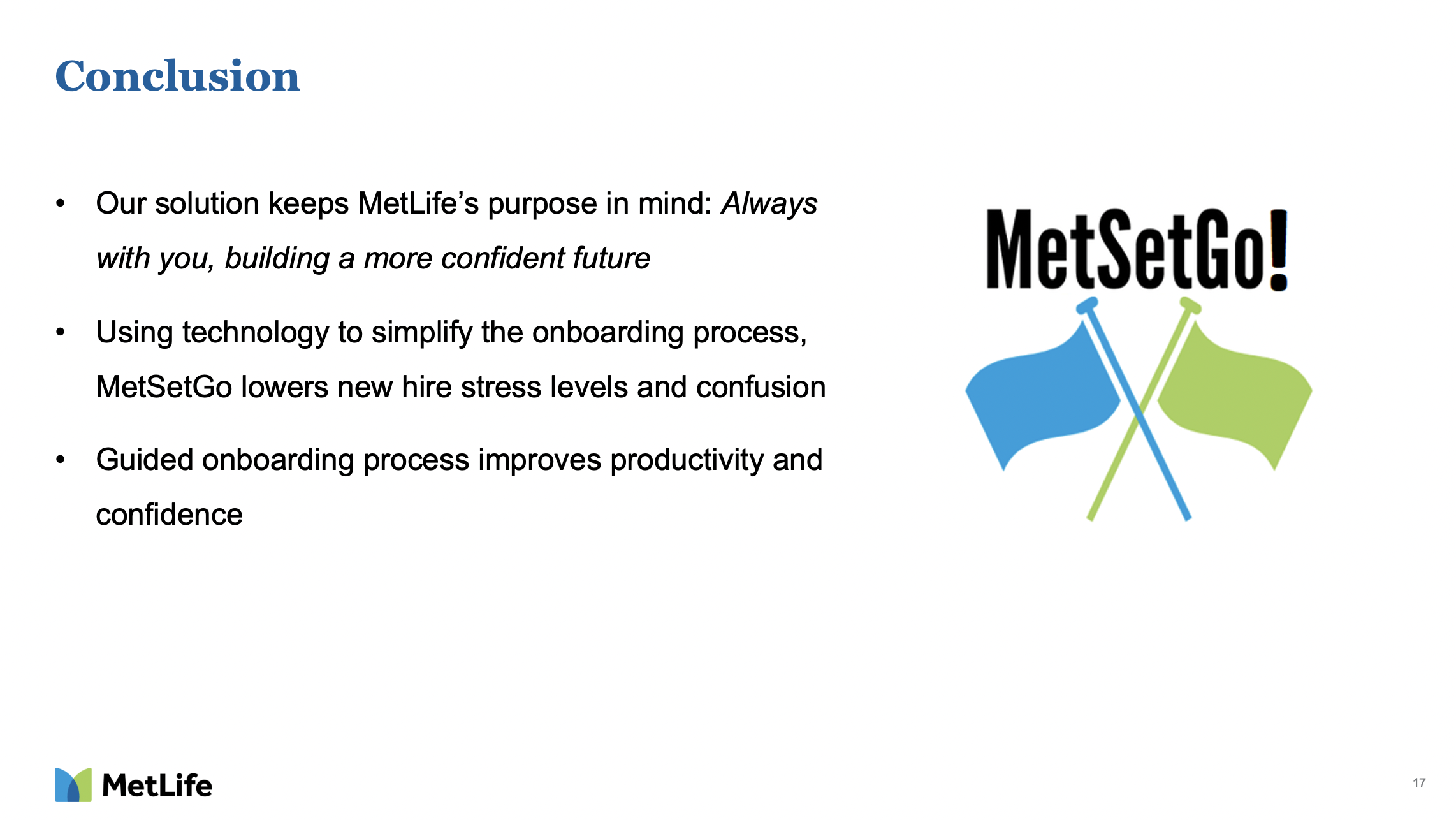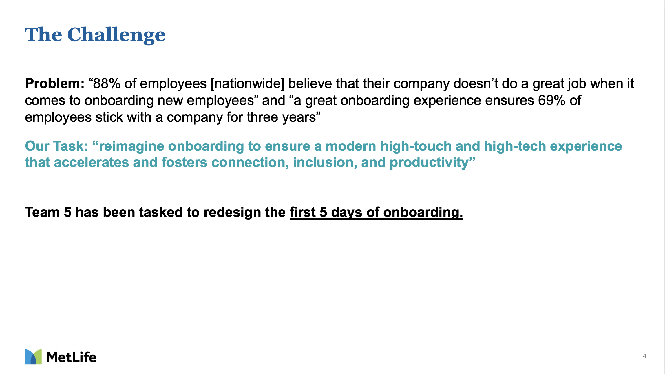 MetLife, a leading global insurance provider with nearly 43,000 employees worldwide, hosts the Innovation Challenge, where interns and program attendees collaboratively devise and pitch creative solutions to specific challenges. This year, our goal was to "reimagine onboarding to ensure a modern high-touch and high-tech experience that accelerates and fosters connection, inclusion, and productivity."