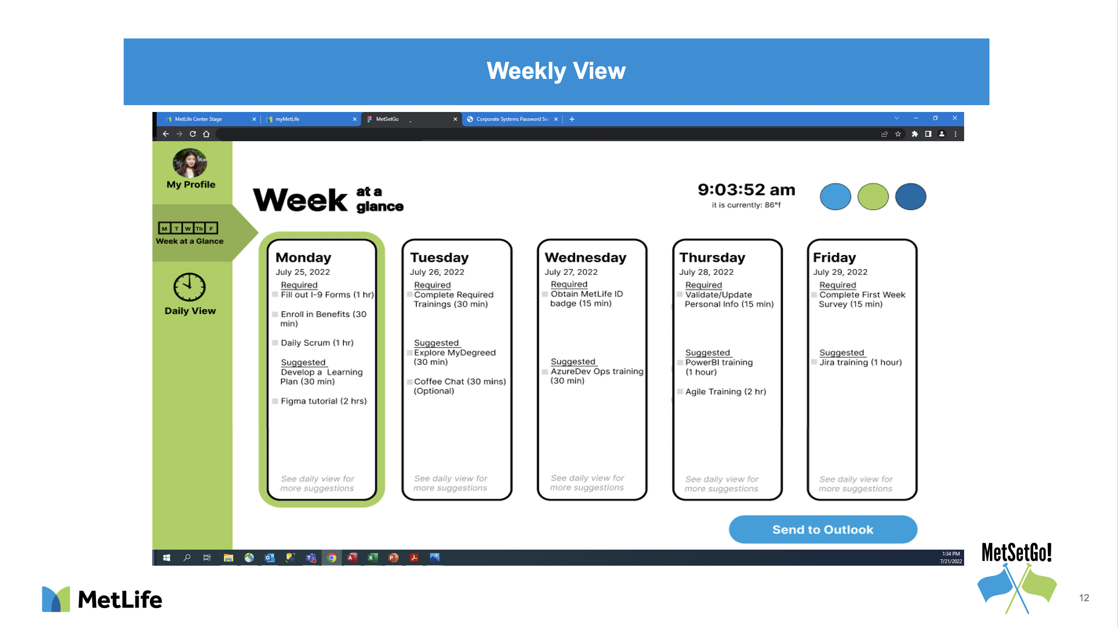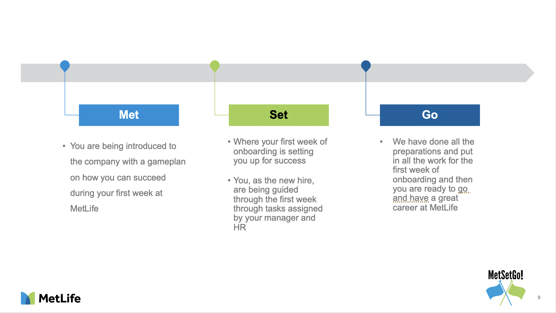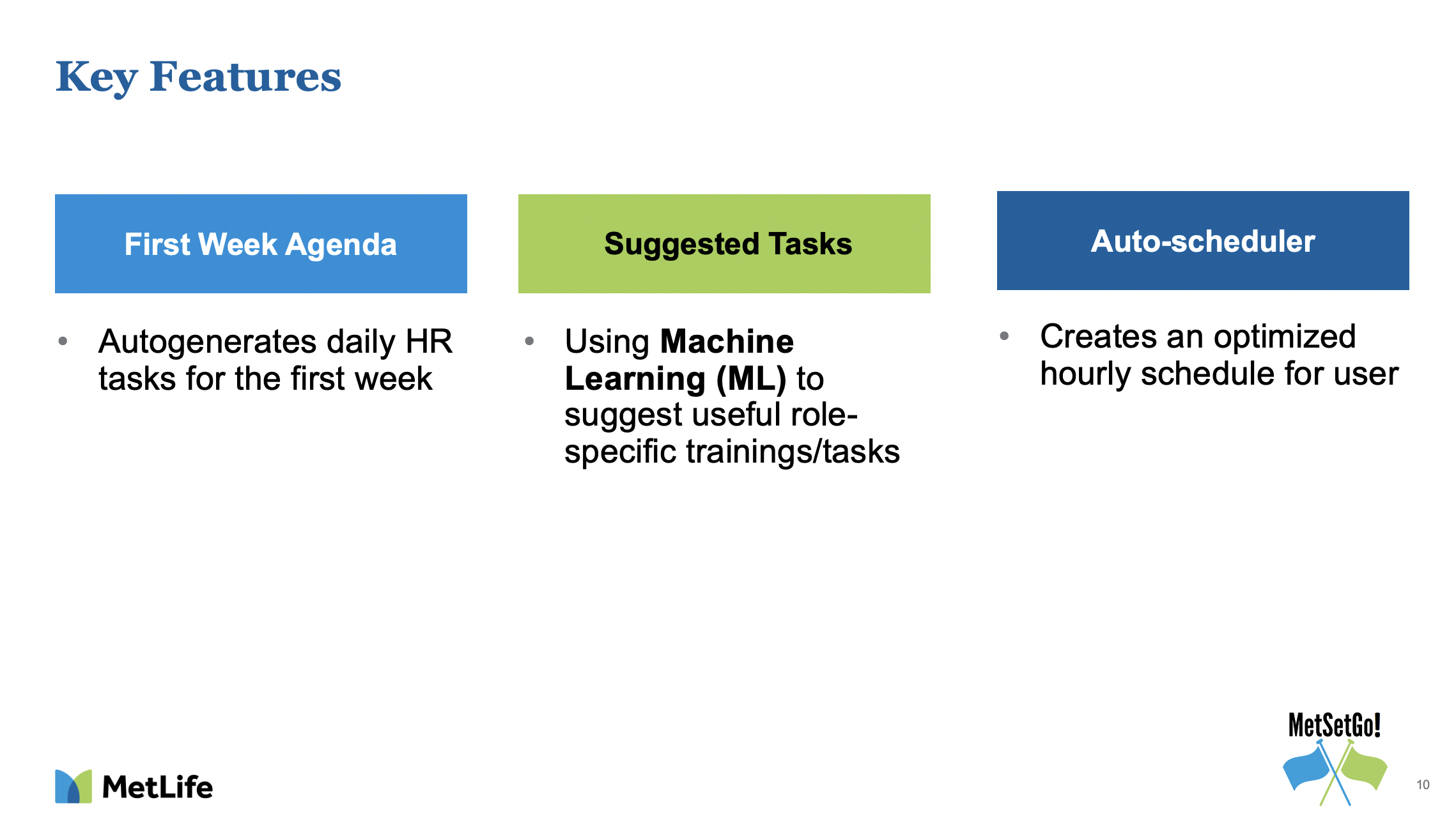 Our solution, MetSetGo, addresses the challenges of decentralization, resource navigation, and complex scheduling. MetSetGo is a self-service, three-component employee onboarding system focused on the new hire's first five days. It leverages technology to reduce potential miscommunication between hiring managers and new employees, standardizes learning and training for each role to eliminate knowledge gaps, and serves as a comprehensive platform for accessing employee-related information and resources.