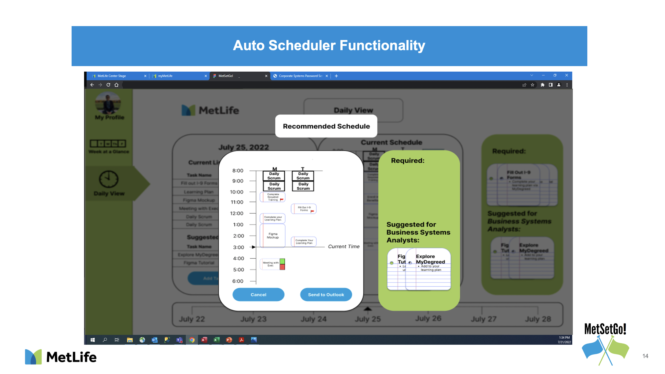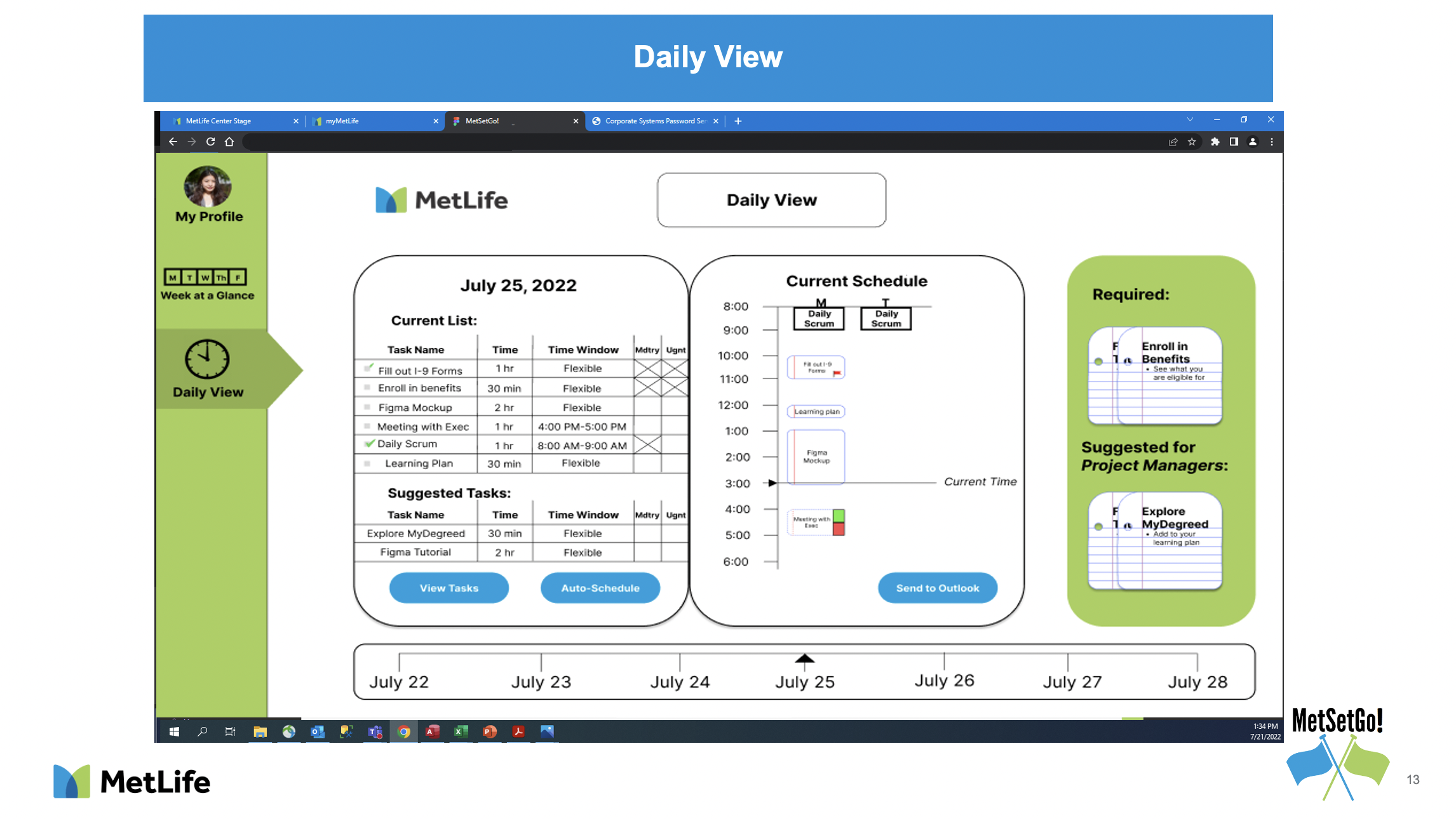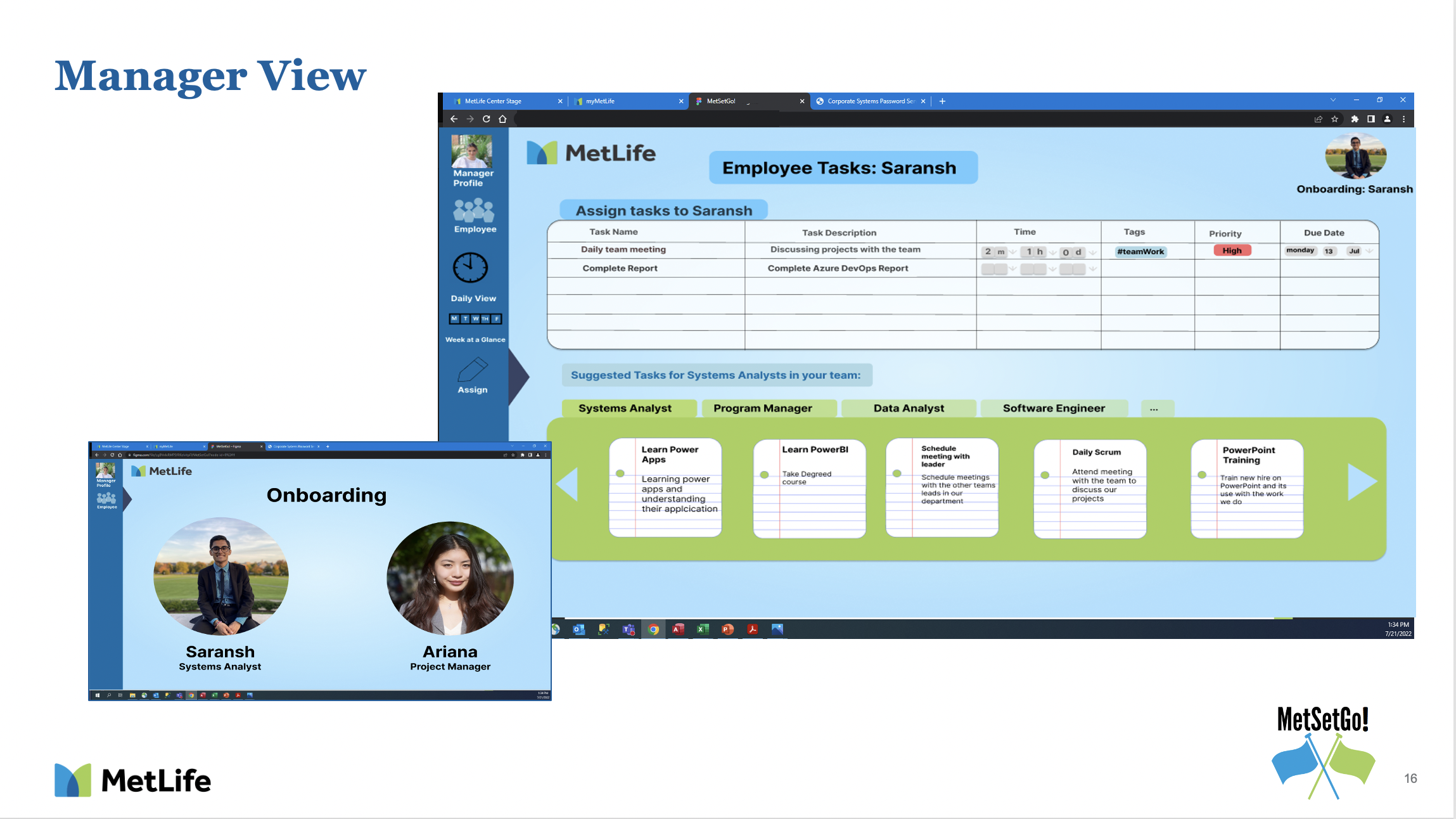 Our solution, MetSetGo, addresses the challenges of decentralization, resource navigation, and complex scheduling. MetSetGo is a self-service, three-component employee onboarding system focused on the new hire's first five days. It leverages technology to reduce potential miscommunication between hiring managers and new employees, standardizes learning and training for each role to eliminate knowledge gaps, and serves as a comprehensive platform for accessing employee-related information and resources.