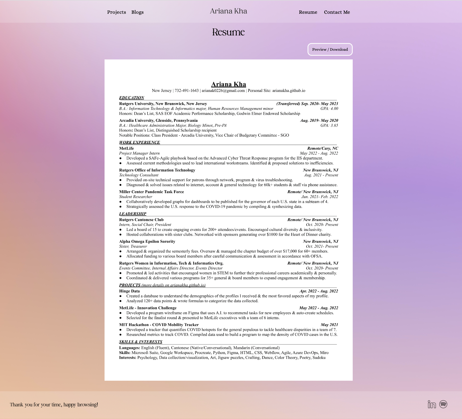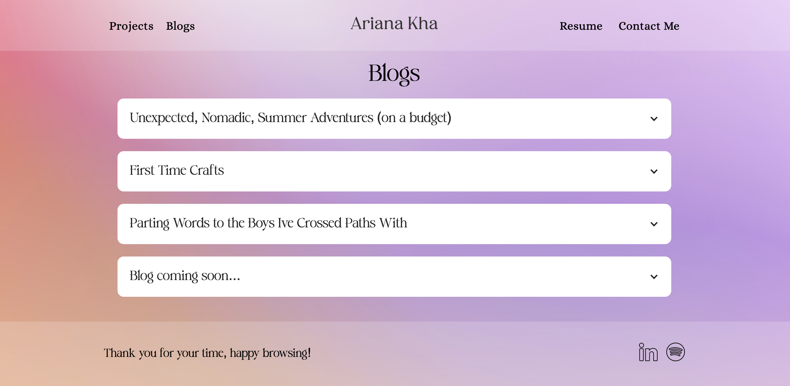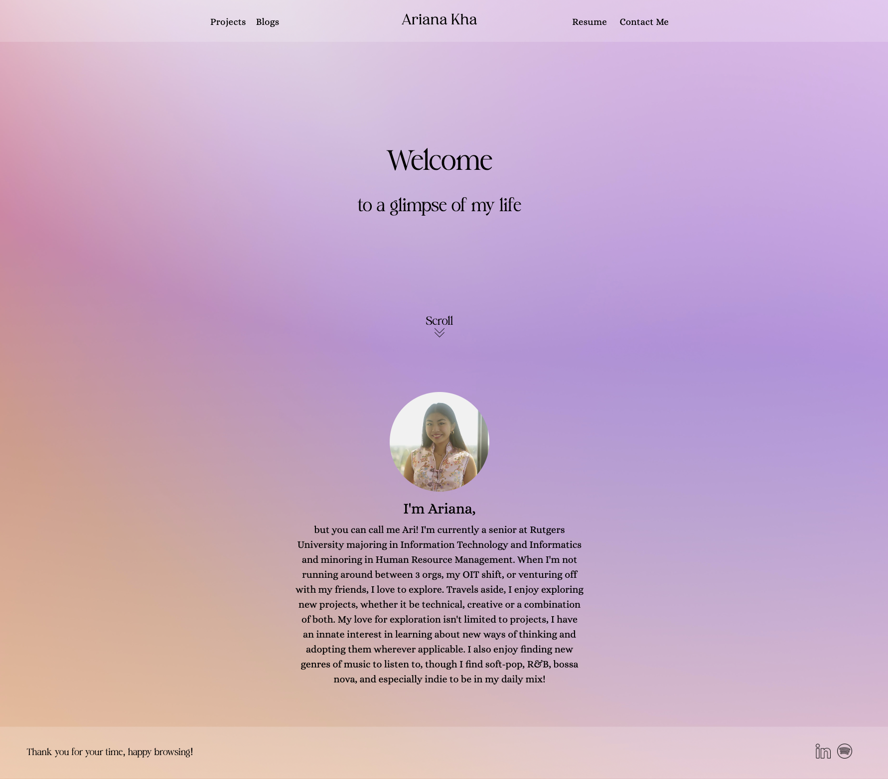 As a first-generation student navigating personal, academic, and professional spheres, I have encountered challenges in effectively presenting my achievements, interests, and learning experiences. This site is designed to serve as a comprehensive personal portfolio encompassing everything from my crafts to my summer internship. Through this platform, I aim to provide an in-depth look into my projects and methodologies, offering insights into what defines me. This page will also shed light on my thought process during the development of this personal site, detailing the iterative process and continuous adjustments made.